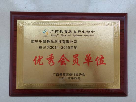 熱烈慶祝南寧千帆獲得由廣西教育裝備行業(yè)協(xié)會(huì)辦頒發(fā)的2014-2015年度“廣西教育裝備行業(yè)協(xié)會(huì)優(yōu)秀會(huì)員單位”證書(shū)。這是廣西教育裝備同行給予我們的肯定。榮譽(yù)激勵(lì)著千帆人再接再勵(lì),爭(zhēng)取為教育事業(yè)作出更多貢獻(xiàn)。